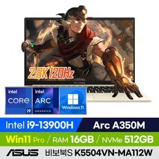 ASUS 비보북S 15 OLED K5504VN-MA113W 게이밍 비즈니스 학습용 업무용 사무용 윈도우11 경량 15인치 노트북 (코어i9-13900H/Arc A350M 그래픽), 윈도우11 프로, 16GB, 512GB, 코어i9, 쿨 실버
