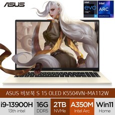 ASUS 비보북S 15 OLED K5504VN-MA112W 게이밍 비즈니스 학습용 업무용 사무용 윈도우11 경량 15인치 노트북 (코어i9-13900H/Arc A350M 그래픽), 윈도우11 홈, 16GB, 1TB, 코어i9, 크림 화이트