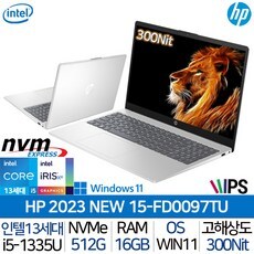 HP 2023 노트북 15 i5-13세대 탑재 300Nit 고해상도 고속충전 슬림형 사무용 업무용 대학생 노트북, FD0097TU, Windows 11 home, 16GB, 512GB, i5, 실버